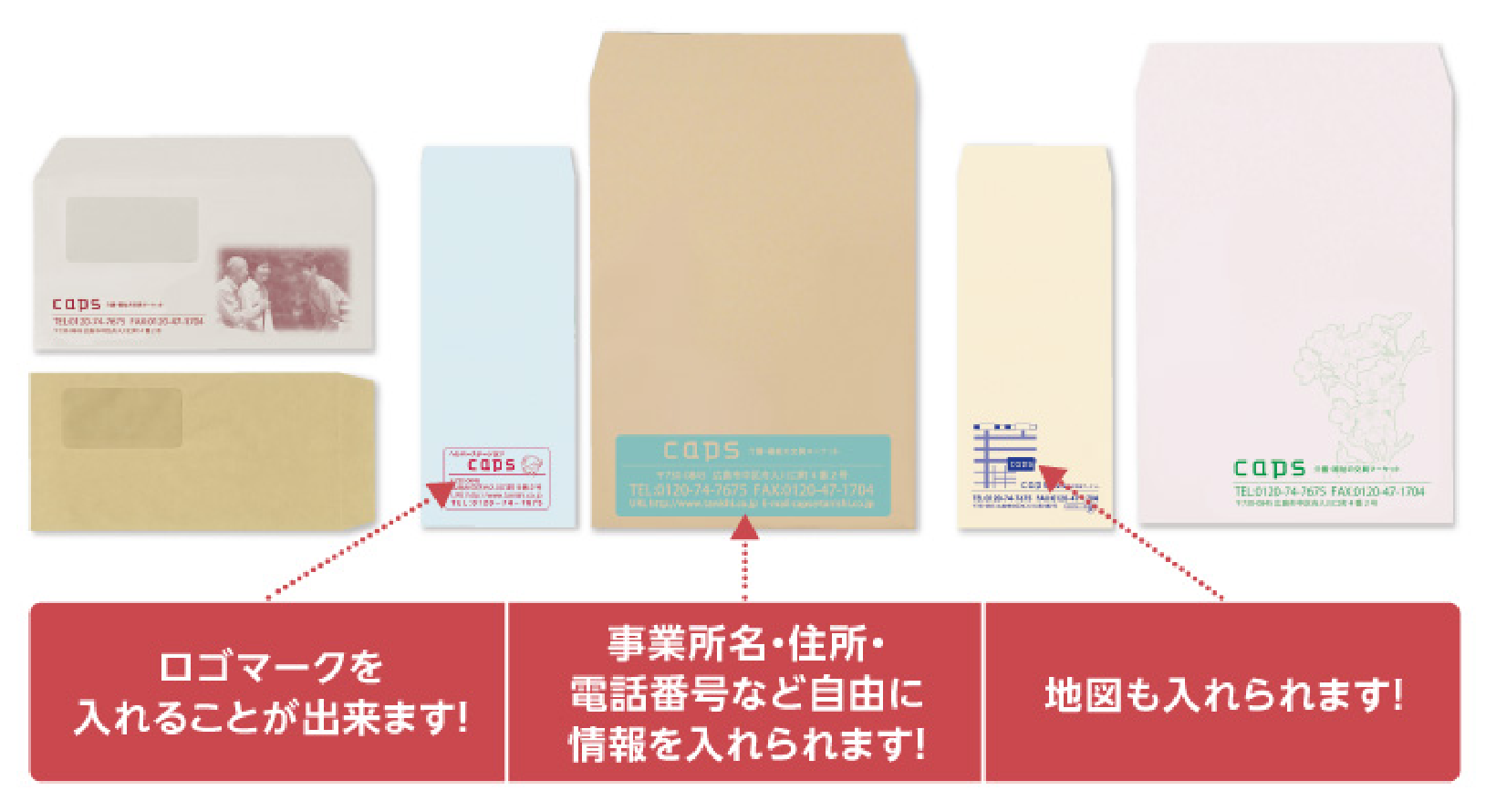 長4封筒や洋長3、洋長窓付き封筒など各種サイズの印刷も承っています。