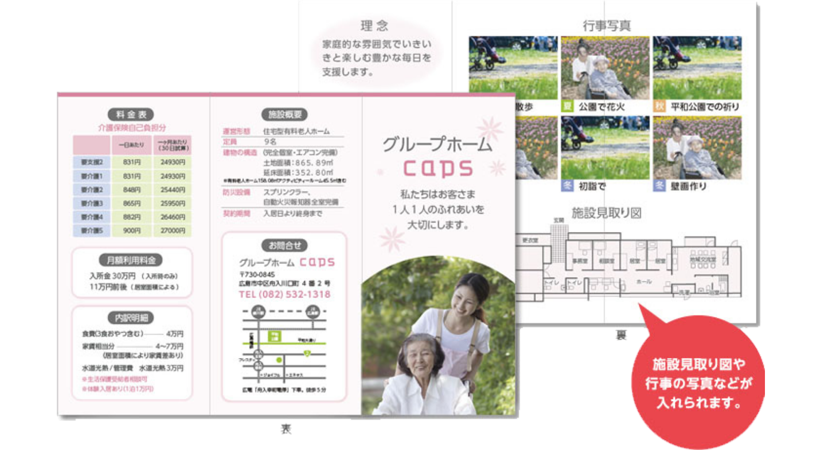 事業所のカラーなどに合わせ、お好きな色やデザインでオリジナリティのあるパンフレット作成をお手伝いします。