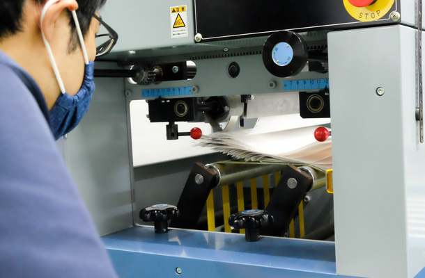 工場では、高性能の印刷機と熟練のオペレータの手によって印刷が行われます。印刷内容のチェックを経て製本され、完成となります。