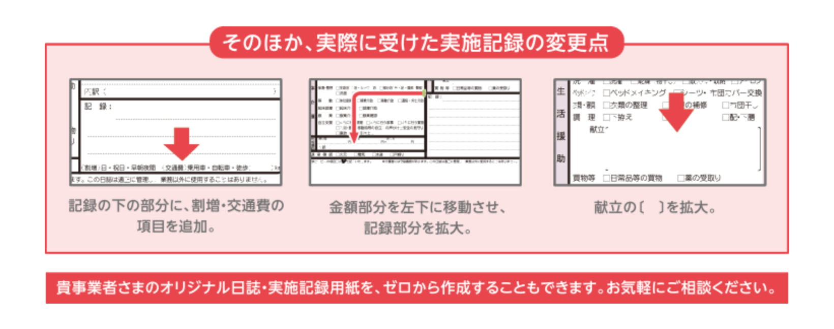 完全オリジナル/事業所名入りの日誌・実施記録をゼロから作成。専任のスタッフが、介護保険の改定内容についてもきちんと対応いたします。早い!使いやすい!安心!と大変ご好評いただいております。