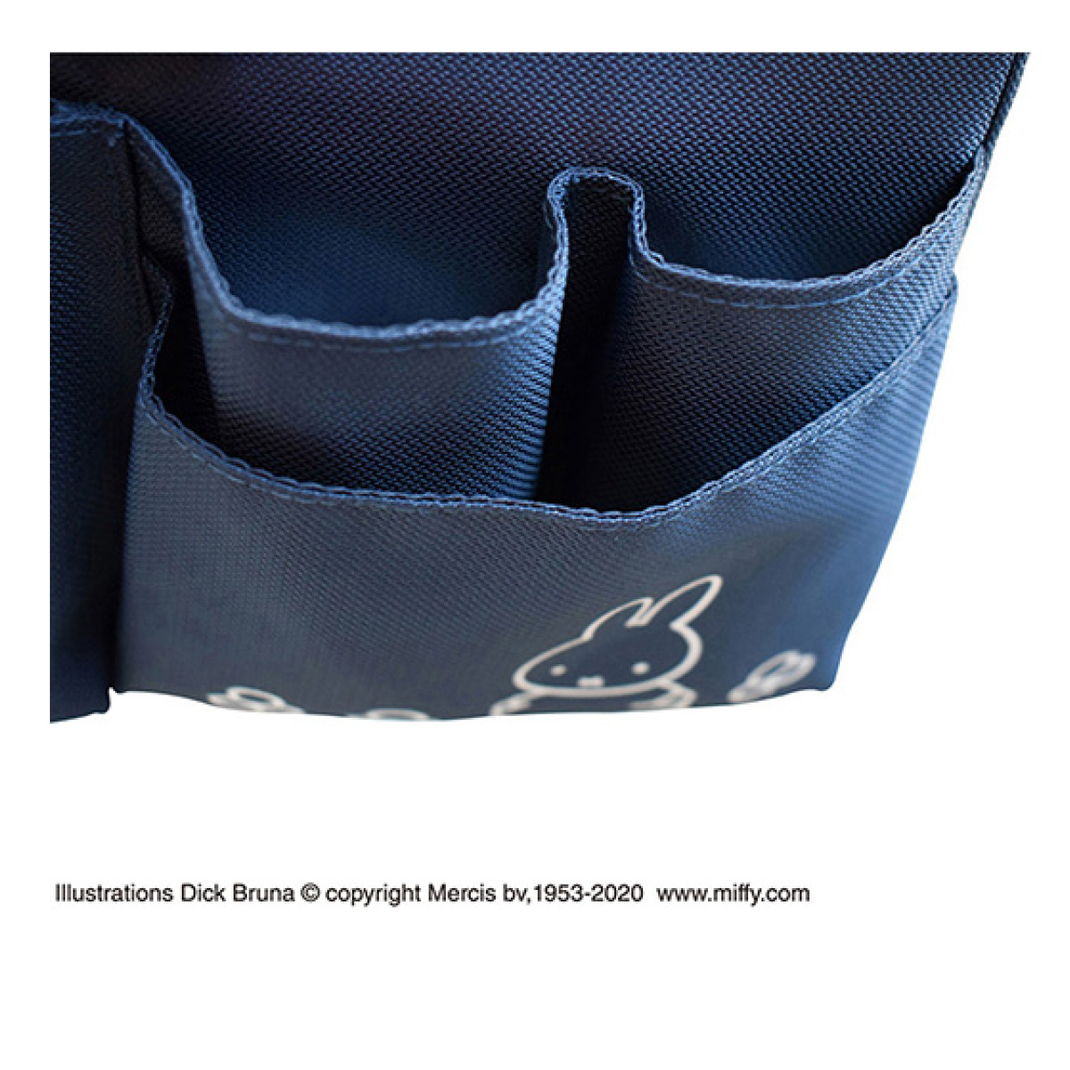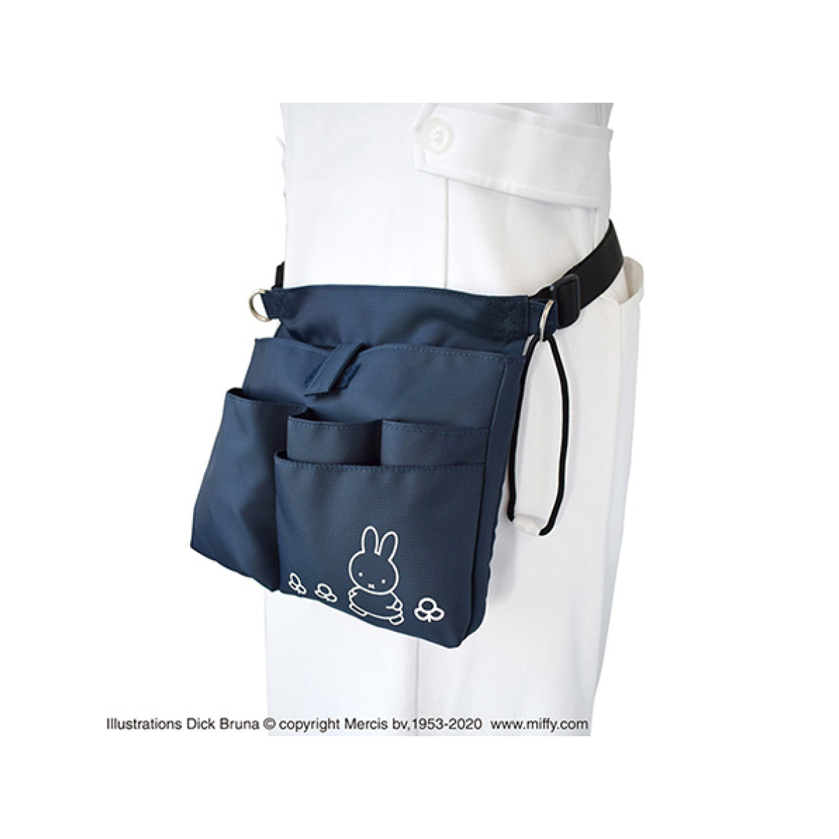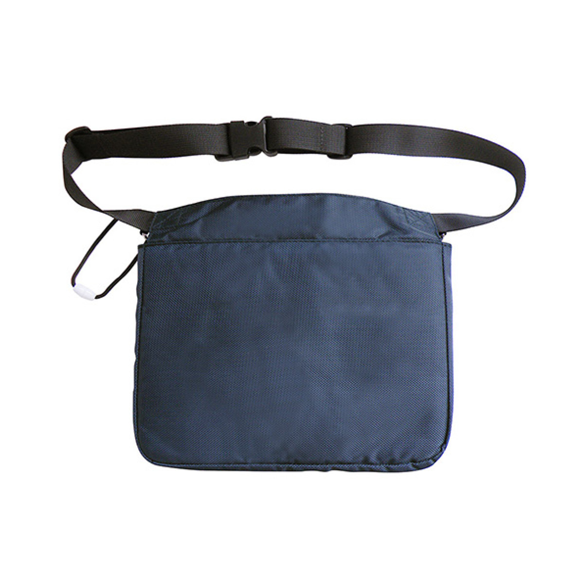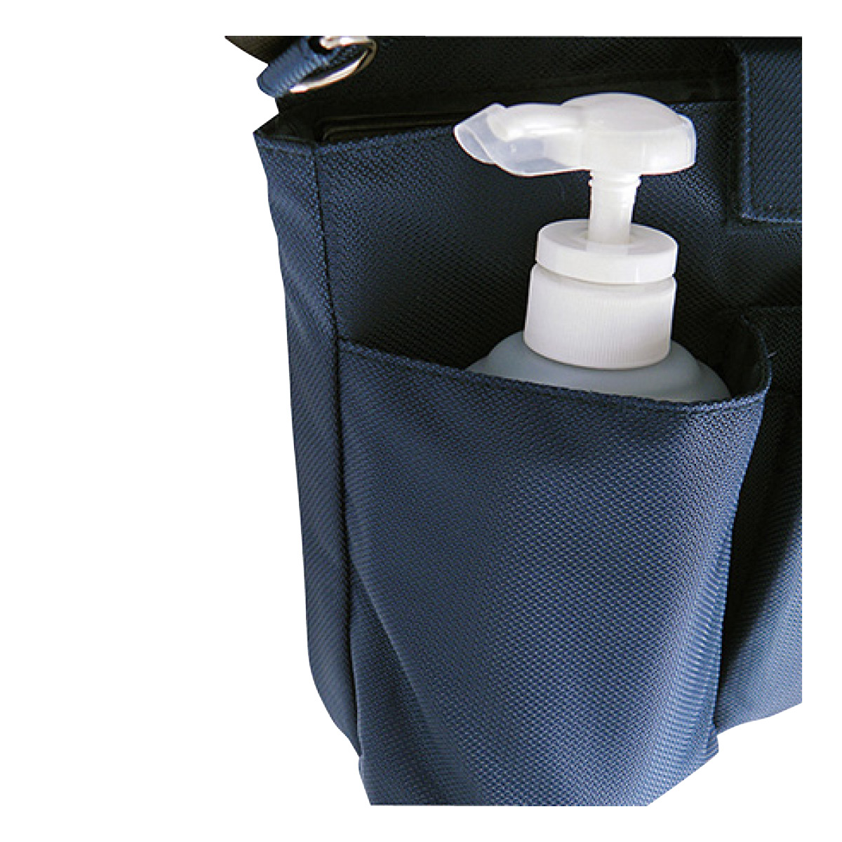 250mLの消毒液や500mLのペットボトルも入れられるポケット(1個)、サージカルテープを吊り下げられるストラップ(1個)、小分けのポケット(3個)、A5版ノートやタブレットが収納で来るポケット(1個)、内側にファスナーポケット(1個)が付いており、たっぷり収納できます。