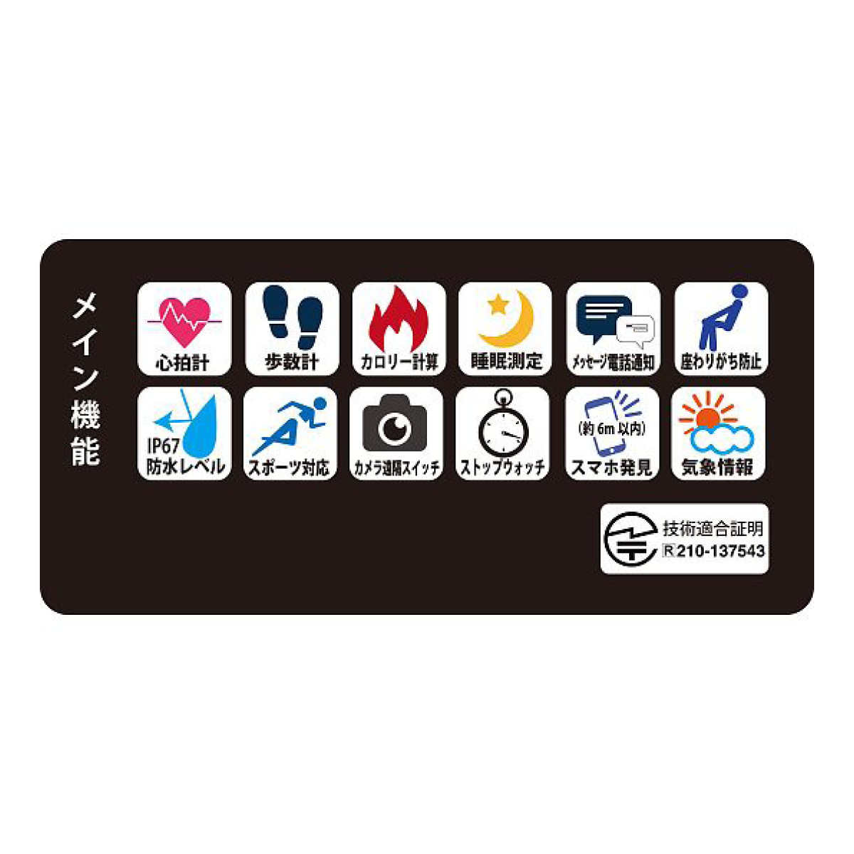 【機能】心拍計、歩数計/距離、カロリー計算、睡眠測定、SNS通知、メッセージ通知、電話通知、座りがち注意、ストップウォッチ、スマホ発見(約6m内)、気象情報、運動/スポーツ各種、カメラ遠隔スイッチ、目覚まし(ウォッチが振動でお知らせ)、待ち受け画面3種、画面明るさ調整、電源ON/OFF、リセット、バージョン情報、タッチボタン、日付表示