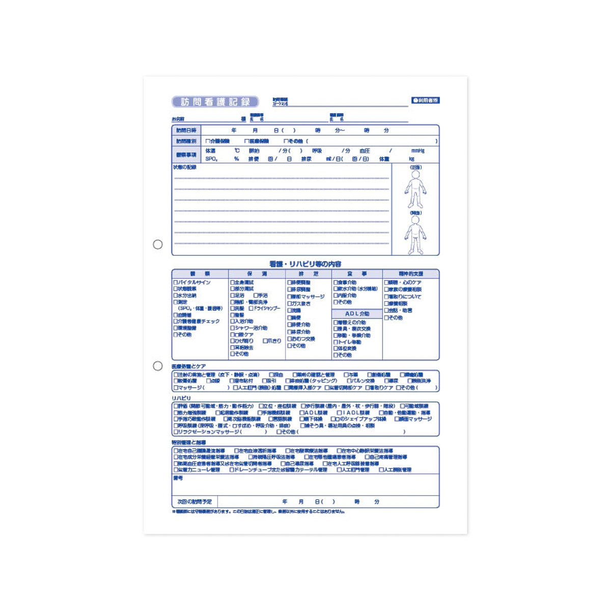 訪問リハにも使用できます。 人型の絵柄入りで記入しやすい、利用者控え、ステーション控えの2枚複写仕様、A4版。