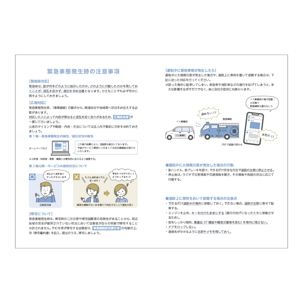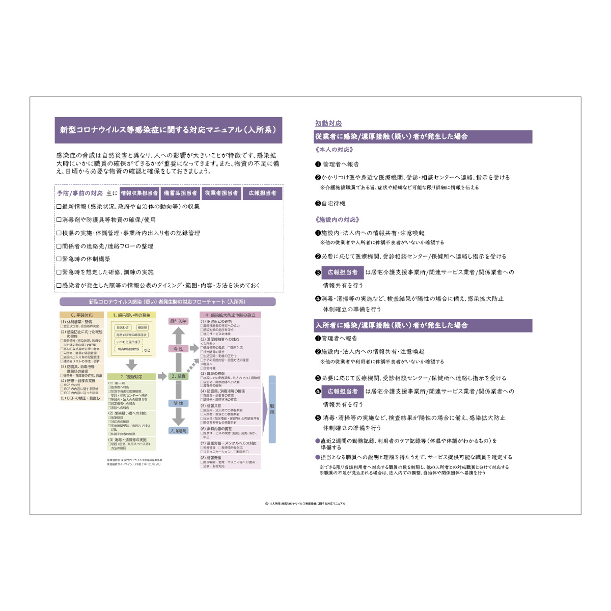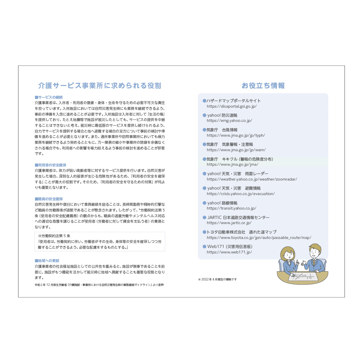 この防災マニュアルは、簡易版BCPとして、実際のBCPでも策定する内容、施設系サービス事業所特有の事項を分かりやすくして盛り込んでいます。