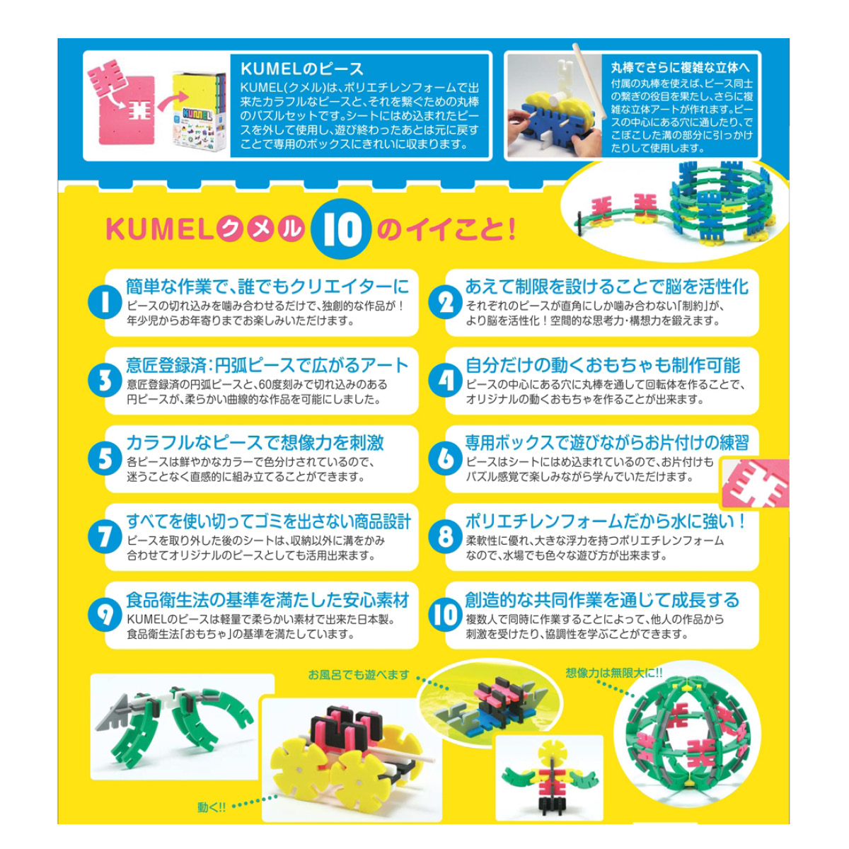 ポリエチレンフォームだから軽くて水に強く、角も丸く加工してあるので小さなお子さまにも安心して遊んでいただけます。カラフルで独創的な形状のピースは、イマジネーションを刺激して脳を活性化させ想像力・集中力を鍛えることができます。
