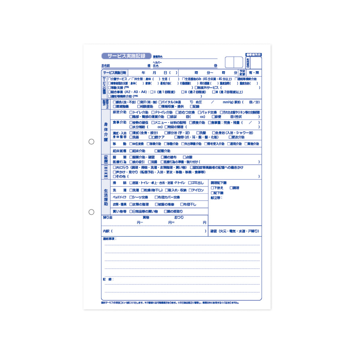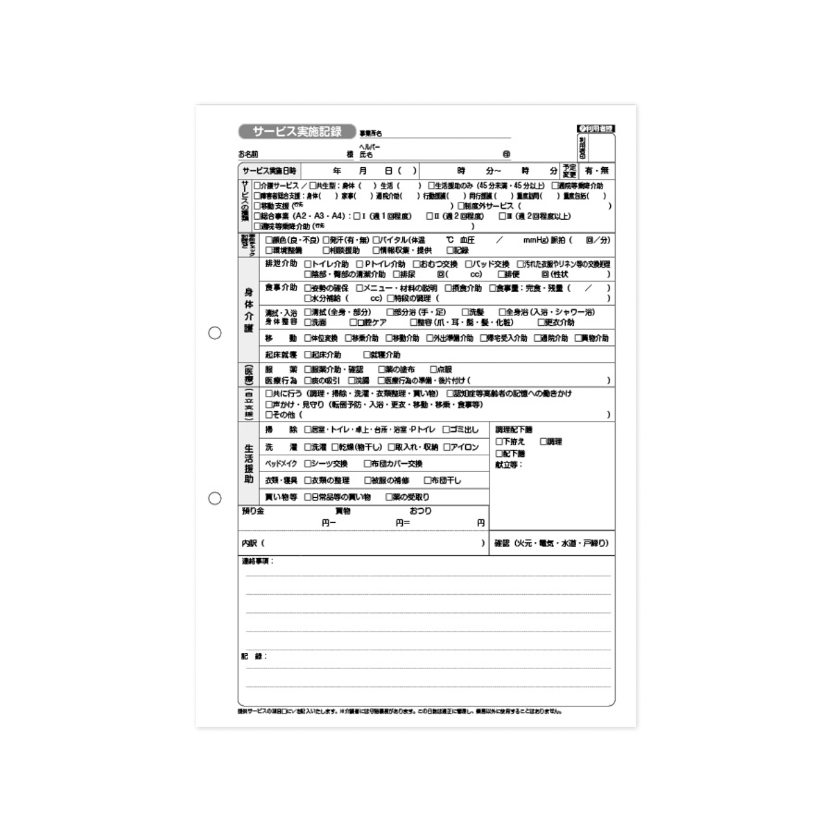 A4版で字が大きく読みやすい介護サービス実施記録票です。