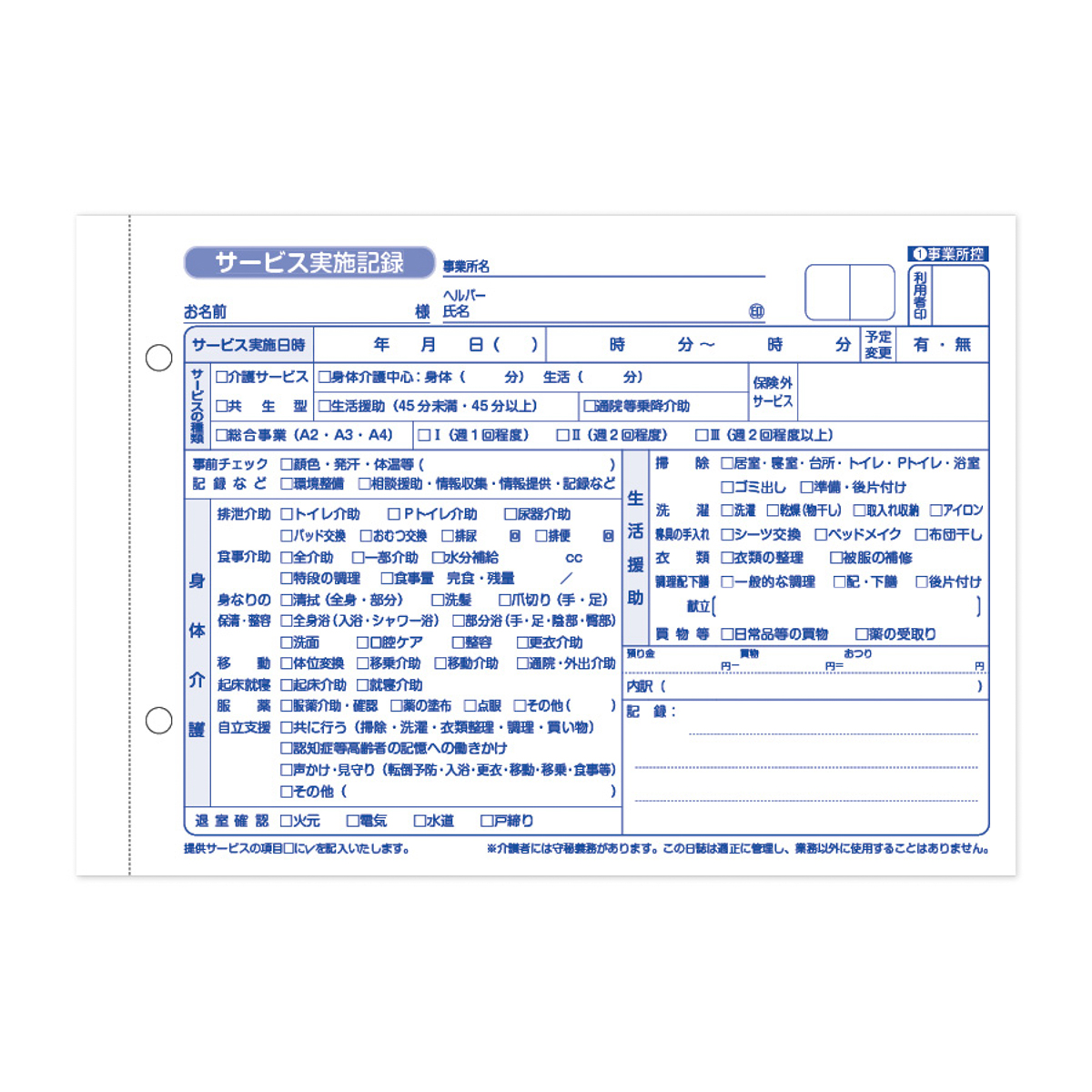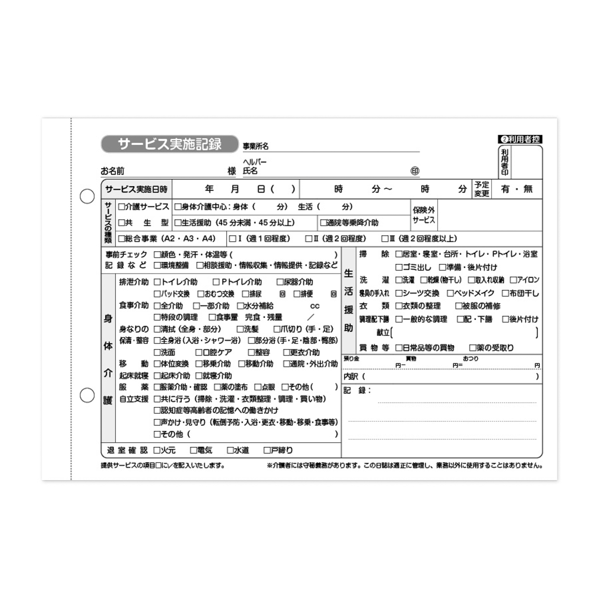 訪問介護事業所(ヘルパーステーション)において訪問介護サービス提供時にヘルパー活動記録として使用する、介護報酬請求の根拠となる『介護サービス実施記録用紙/介護記録』です。
