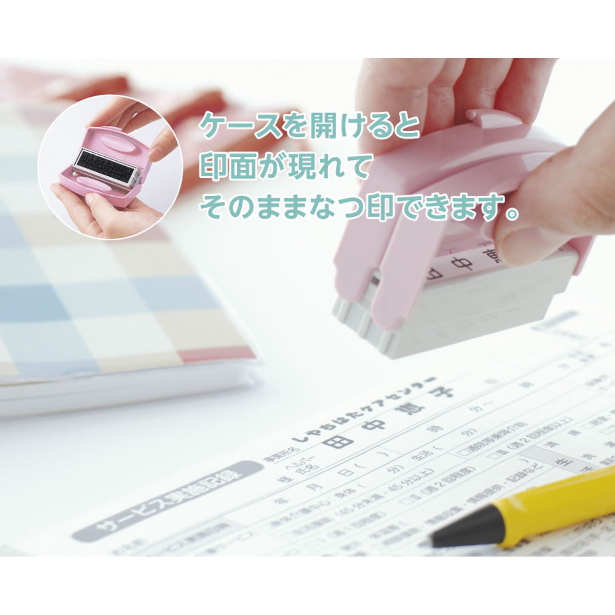 朱肉不要でポケットサイズのシャチハタ印鑑。ケースを開けると印面が現れて、実施記録に「事業所名&名前」をそのままなつ印できます♪