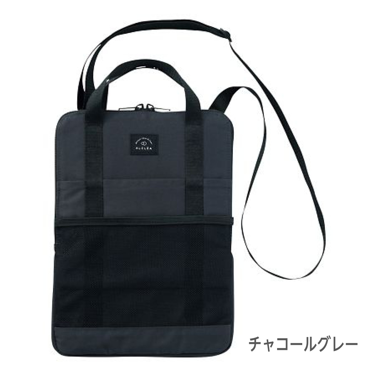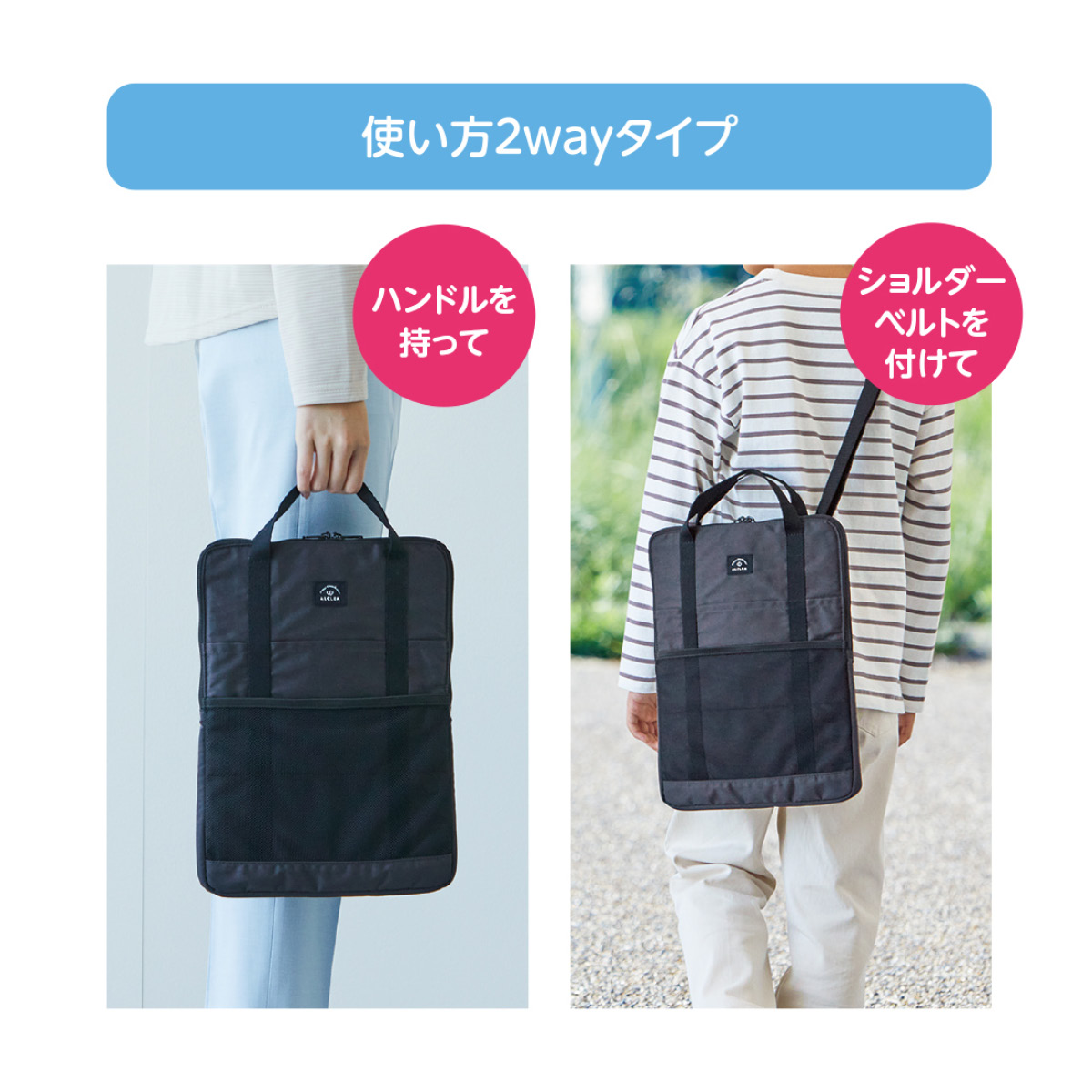 コの字型に開くダブルファスナーで収納物が取り出しやすく、前面には小物が収納できるポケット付きです。
